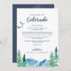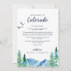 Estas tarjetas de bienvenida e itinerario de los bodas de Colorado son perfectas para un boda al aire libre. El diseño presenta un paisaje natural pintado de azul y verde con pinos acuarelas, pájaros y montañas. La parte delantera de la tarjeta incluye una carta de bienvenida y la parte trasera de la tarjeta incluye el itinerario del boda. Estas notas son perfectas para bodas de destino y bolsos de bienvenida para huéspedes del hotel. Personalizar esta carta para cualquier lugar de la boda de destino de montaña.