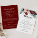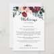Esta carta de bienvenida de boda floral de color rosa rojo burdeos es perfecta para un boda rústico. El diseño se compone de peonías color agua rosa, rubor, marina, azul y borgoña, rosas con follaje verde cuidadosamente ensamblados en elegantes ramos. Personalice la parte delantera con un mensaje de bienvenida para sus invitados y sus nombres. Personalice la parte posterior con la programación de eventos y otra información útil.
