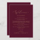 Estas delicadas cartas de bienvenida de oro y borgoña y tarjetas itinerarias son perfectas para un boda moderno. El romántico diseño minimalista presenta una encantadora y elegante tipografía de champán amarillo dorado sobre un fondo rojo burdeos con un aspecto limpio y sencillo. La parte delantera de la tarjeta incluye una carta de bienvenida y la parte trasera de la tarjeta incluye el itinerario del boda. Estas notas son perfectas para bodas de destino y bolsos de bienvenida para huéspedes del hotel.