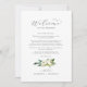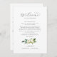 Estas elegantes cartas de bienvenida con flores blancas y tarjetas itinerarias son perfectas para un boda clásico. El moderno diseño vintage presenta un bonito y romántico rosa de marfil y acuarela crema y flores de peonía con hojas de color verde oscuro, vegetación y productos botánicos. La parte delantera de la tarjeta incluye una carta de bienvenida y la parte trasera de la tarjeta incluye el itinerario del boda. Estas notas son perfectas para bodas de destino y bolsos de bienvenida para huéspedes del hotel.
