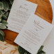 Estas cartas de bienvenida y tarjetas itinerarias son ideales para un boda boho. El diseño presenta una sencilla silueta de hojas de verdor en un naranja quemado en tierra sobre un fondo crema de estilo bohemio minimalista del desierto. La parte delantera de la tarjeta incluye una carta de bienvenida y la parte trasera de la tarjeta incluye el itinerario del boda. Estas notas son perfectas para bodas de destino y bolsos de bienvenida para huéspedes del hotel.