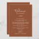 Estas cartas mínimas de bienvenida de terracota y tarjetas itinerarias son perfectas para un boda boho. El diseño presenta una sencilla silueta de hojas de vegetación en un naranja ardiente y de estilo bohemio minimalista del desierto. La parte delantera de la tarjeta incluye una carta de bienvenida y la parte trasera de la tarjeta incluye el itinerario del boda. Estas notas son perfectas para bodas de destino y bolsos de bienvenida para huéspedes del hotel.