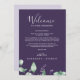 Estas rústicas cartas de bienvenida y tarjetas itinerarias de color morado de lavanda son perfectas para un boda al aire libre sencillo y elegante. El diseño floral incluye hojas de eucaliptos acuáticas y vegetación con brotes de flores violetas sobre un fondo de ciruela morada. La parte delantera de la tarjeta incluye una carta de bienvenida y la parte trasera de la tarjeta incluye el itinerario del boda. Estas notas son perfectas para bodas de destino y bolsos de bienvenida para huéspedes del hotel.