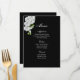Carta de menú mostrada en papel básico en negro con una hermosa huella de orquídeas blancas. Guión y texto estándar en blanco. Personalizar los elementos del menú haciendo clic en el botón personalizar, busque a la derecha y busque los cuadros apropiados para cambiar a su información. Deseándote los mejores deseos para tu Día de la Boda.