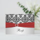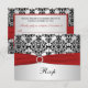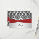 Esta tarjeta de respuesta de boda de damasco gris negro y plateado tiene una cinta impresa roja y una hebilla de joyas de diamante impresa que coincide con las dos invitaciones de boda que se muestran a continuación. ****TENGA EN CUENTA que algunos de los papeles alterarán el color del diseño, así que tenga cuidado al seleccionar el papel. NO usaría el papel plateado metálico, dorado o champán, ni el papel de fieltro para esta invitación. El papel plateado metálico oscurecerá mucho el diseño, ya que es mucho más oscuro en persona de lo que se muestra aquí. ADEMÁS, Zazzle no editará nada por errores tipográficos o desalineación, y yo no veré la tarjeta en absoluto. Todo se imprimirá tal como aparece en su monitor, así que si necesita que se cambie algo, por favor contácteme ANTES de realizar su pedido y estaré encantado de ayudar. Si desea un tamaño de tarjeta diferente, por favor NO lo cambie usted mismo. Este diseño fue creado como un tamaño de 3,5 "x 5", por lo que cambiarlo a otro tamaño alterará la proporción del diseño y partes del mismo se cortarán durante la impresión. Sería perfecto para una boda con tema rojo, plateado y negro, una boda de otoño o una boda de invierno. El texto y el tipo de papel son personalizables. Si necesita otros artículos que coinc