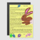 Cartas personalizadas del conejo de Pascua. Fondo amarillo. Conejo de conejo marrón con Huevos Decorados Verde, Azul, Morado. ¡Las cartas están firmadas por el propio conejo de Pascua! Conejo de conejo marrón con grandes orejas rosas, nariz y boca, diente blanco y cola de cottontail, con huevos de puntos azules decorados de colores, huevo rayado blanco verde y huevo violeta de bonito con flor verde, con texto verde sobre un fondo verde de menta primaveral. La carta está dirigida al Chica (para dirigirse al Boy simplemente reemplazar la redacción de Boy por Chica). PERSONALIZAR las letras escribiendo en cada nombre, año de mes, ciudad natal, etc. escrito en el cuerpo de la carta por separado, y Añadir al carrito de compras. LA(S) CARTA(S) SE "ENVIARÁ" AL CLIENTE QUE HAYA PEDIDO. Cuando se acerca la hora de Pascua, simplemente añada un sello e insértelo en el sobre (ver mi tienda para los sobres festivos A7 7 1/4" W x 5 1/4" H de Pascua con el colorido círculo de correo oficial del conejo de Pascua impreso en el sobre para diversión extra de "creer"), y envíe por correo el sobre del conejo de Pascua al niño. (¡Shh! ¡Por supuesto que el conejo de Pascua te envió por correo electrónico!) ¡Asegúrate de darte el tiempo suficiente para que la carta LLEGUE al destinatario a tiempo para disfrutar al menos un par de semanas antes de Pascua! O, si ordenan la carta a último minuto (el conejo de Pascua puede dejar su carta dentro de su canasta de Pascua). A los niños les encantará su carta magnética del conejo de Pascua que se exhiba en el refrigerador, el caballete, etc. ¡Buena carta de mantenimiento y gran tradición familiar! ¡Niños de todas las edades esperarán que el conejo de Pascua les envíe una "nueva carta" especial en el correo año tras año! NOTA: Si elige Personalizar la letra completa con SU propio texto, elimine mi texto y asegúrese de que el texto se encuentra dentro de la previsualización de las líneas de puntos rojas seguras (notará que algunas frases pueden tener que ser separadas por la barra espaciadora para que encajen dentro de líneas seguras de bordes). Material gráfico original, Verse Design Copyright © 2013-2016 TamiraZDesigns.