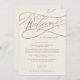 Estas románticas cartas de bienvenida de oro y marfil y tarjetas itinerarias son perfectas para un simple boda. El moderno diseño clásico presenta vistosos remolinos y florituras con una preciosa y elegante tipografía de Relieve metalizado de oro con chaflán a mano con letras falsas y oro. La parte delantera de la tarjeta incluye una carta de bienvenida y la parte trasera de la tarjeta incluye el itinerario del boda. Estas notas son perfectas para bodas de destino y bolsos de bienvenida para huéspedes del hotel. Nota: Este diseño no tiene Relieve metalizado oro real. Es un gráfico de alta calidad hecho para parecer un Relieve metalizado dorado.