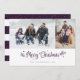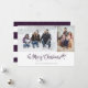 Tarjetas fotográficas personalizado morado de Feliz Navidad con dos fotos con un título de caligrafía en la parte delantera y rayas moradas y blancas en la parte trasera. Personaliza fácilmente estas tarjetas de fotos de Navidad de caligrafía púrpura con tus imágenes, un nombre familiar y el año.