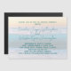 Invitaciones nupciales con respaldo magnético. Fuentes azul-verde con nombres en escritura manuscrita. Un fondo claro de olas rompeolas y cielo dorado a medida que el sol se eleva.