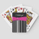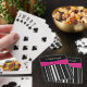 Muestra tu estilo y personalidad únicos con esta cubierta monogramada de la marca de bicicleta jugando a las cartas con un patrón de rayas rosas calientes, negras y blancas con una cinta rosada IMPRESA, un medallón de botón IMPRESO y puntos para añadir tu propio nombre, monograma, logotipo, iniciales u otro texto. Haría un gran regalo para la casa, un regalo para la fiesta de la boda o un fiesta o un favor de la boda.