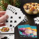 Hermosa foto de flores de peonía rosa sobre fondo amarillo y azul con puntos blancos jugando a las cartas.