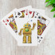 Los robots pueden ser amigables como lo demuestra este diseño. Este diseño es un robot amigable que está parado y ondeando. El robot es dorado y tiene un botón verde en el pecho y ojos verdes. Este simpático diseño de robots se ve genial en estas cartas de juego. Perfecto para usted o como regalo