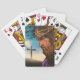 Una escena de Jesús con un perfil de Jesús en primer plano y una cruz en una colina en el fondo paisajístico. Jesús está usando una roca púrpura, con tonos azules, verdes y acuáticos en el cielo. Una ráfaga blanca brilla desde las nubes hacia la Cruz. Obra de arte original realizada por los acrílicos tradicionales cepillados y aireados por Gregg de los Colores Profundos de Gregg.