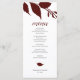 Estas tarjetas de menú boda con temática burdeos ofrecen un diseño moderno y minimalista con detalles sencillos de hoja a la sombra de un marrón profundo, perfecto para elegantes eventos nocturnos o un sencillo micro boda. Utilice la plantilla de la tarjeta de menú boda para personalizar con facilidad de elementos de menú, nombres de invitados y detalles de eventos. Ideal para los bodas, las duchas de novias o las cenas de ensayo, la carta boda ofrece un marco de lo más elegante y una práctica decoración de mesa. Diseñadas para complementar la decoración boda de color burdeos, se combinan con las piezas de la suite de papelería de casamiento Do Tell A Belle. Explorar tarjetas de selección de menú de bodas más elegantes y coordinar diseños de borgoña en: https://www.zazzle.com/collections/burgundy_wedding_stationery_suite-119966989828290454