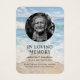 Hermosas tarjetas funerarias/conmemorativas/oraciones con una foto sobre un fondo costero de olas oceánicas que desembocan en una playa de arena.