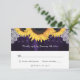 Rústica tarjeta RSVP de boda morada y girasol con girasoles, luces de cuerda y encaje floral blanco sobre un fondo de madera.
