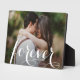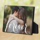 Esta encantadora placa de foto de mesa tiene un caballete incorporado para la exhibición sin marco de su foto favorita. Cuenta con la palabra POR SIEMPRE en una hermosa letra blanca, sus nombres y la fecha de la boda. Cree un recuerdo de su foto favorita o regale como obsequio.