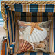 Una almohada de diseño moderno con conchas y estrellas de mar. Hermoso para una casa de playa o para un ambiente costero.