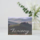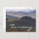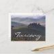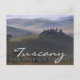 Postal de una casa de campo en la niebla matutina al amanecer en la Toscana entre las colinas onduladas del valle Val d'Orcia entre Pienza y San Quirico d’Orcia en Italia con el texto: Toscana, San Quirico d'Orcia.