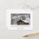 Postal de una tradicional cabaña de madera con postigos verdes en un bosque en la nieve en invierno en Baviera en la frontera entre Alemania y Austria con un borde blanco y el texto: 'Bayern', alemán para 'Baviera'.