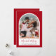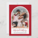Tarjeta mínima y elegante de vacaciones de invitación nupcial para recién casados que incluye tu foto en un marco de imagen abovedado contra un fondo rojo oscuro. Puedes personalizar el saludo "Married & Merry" en un moderno guión rojo y tu saludo de vacaciones, nombres y el año en una tipografía simple.