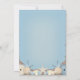 Una invitación hermosa del boda del destino con un tema exótico de la playa. La disposición del texto en esta invitación se diseña para las ocasiones donde los padres de la novia están recibiendo el boda, otras disposiciones está disponible. Un modelo bonito del fondo de la textura de la arena en tonos poner crema neutrales y sombras del azul de océano se dispersa con las porciones de pocos guijarros de la playa. Encima de los guijarros son una variedad de cáscaras, de erizos de mar, de estrellas de mar y de perlas del mar.