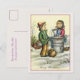 Una postal vintage, un dibujo antiguo restaurado y retocado, en el que aparece un niño, que lleva regalos de vacaciones en una canasta, y una niña asando castañas, mientras está nevando.