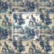 El elegante diseño clásico de toile de jouy cuenta con un castillo en un entorno boscoso. El color azul oscuro del color azul oscuro está impreso en un fondo de marfil envejecido. Va naturalmente con eventos de cuento de hadas, princesa o de estilo vintage. La impresión es una repetición en mosaico.