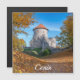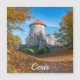 Paisaje otoñal de fortaleza con torres de piedra rodeadas de árboles amarillos y naranjas. Castillo de Cesis en Letonia