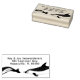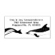 Sello de goma de dirección de regreso de delfines. El sello largo y delgado funciona bien para el dorso de los sobres. El diseño son dos delfines: la cola de uno y la cabeza y la mayor parte del cuerpo del otro, nadando debajo del texto. Fuente pequeña impresa con espacio para solo tres líneas.