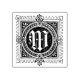 Letra M primera letra caligrafía de estilo gótico vintage dibujada a mano. La letra manuscrita M se centra en un marco circular y en un marco exterior cuadrado. Acondicionado con olas, puntos y líneas decorativas.