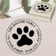 Devolver marca de goma de dirección con una huella de pata en el centro y campos de plantilla para su nombre y dirección de retorno rodeada por un borde redondo.