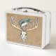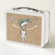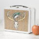Bajo de largemouth saltando sobre el cráneo de ciervo de antler grande con diseño de fondo de patrón de imitación de hojas. Pan y ciervo dibujado a mano por ©Tina Hesskew de Fishing Hunting Life.