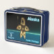Este sello postal de un Alaska independiente muestra una imagen fractal de tono marrón que sugiere a un cazador inuit altamente estilizado, usando ropa de piel tradicional y sosteniendo un arpón con una cabeza de marfil. La imagen es superpuesta en un fondo que representa el oscuro invierno polar. El texto que dice "Alaska", "Postage 3 Nuggets" y "Arctic Heritage" aparece en azul y blanco resplandeciente.