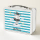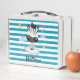 Presentamos la Cute Baby Zebra Sitting on Clouds, Stars, and Moon Metalizado Lunch Box, ideal para volver a la escuela! En esta adorable lonchera hay una cebra pequeña rodeada de nubes, estrellas y una luna, todo ello contra rayas azules y blancas de moda. Ideal para los niños amantes de los animales de safari y de los temas modernos de la jungla, esta lonchera de colores pastel combina la amabilidad y la funcionalidad. Es un accesorio único y divertido que añade un toque de frescura a cualquier día escolar.
