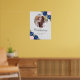 Elegante letrero de bienvenida para funeral/memorial floral en acuarela con una foto adornada con rosas azules y rosadas y flores de aliento de bebé sobre un fondo con patrón botánico.
