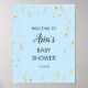 Este cartel de bienvenida de la celebración de oro en Baby Shower azul es perfecto para una elegante ducha de bebé para un niño. El diseño es moderno, con una decoración en tonos dorados falsos y un fondo azul pálido con una caligrafía elegante. Personalizar para una rociada de bebé o una fiesta de primer cumpleaños.