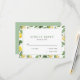La primera temporada de cosecha de limón es desde finales de invierno hasta principios de verano. Sin embargo, se puede celebrar el deleite de la floración cítrica durante todo el año con esta invitación a la boda rsvp con temática de limoneros. Este artículo en particular presenta un vibrante patrón de limón amarillo y verde junto con los detalles de su boda en gris profundo o verde. En el reverso hay un verde jade que complementa la parte delantera. Perfecto para bodas de primavera y verano, pero muy bueno todo el año.