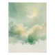 Transform your nursery into a tranquil haven with this luminous watercolor print. The scene features a glowing crescent moon resting among mint-green clouds, framed by twinkling golden stars against a creamy pastel sky. The blank lower space is ideal for adding your child’s name or a special quote.
