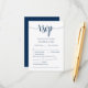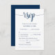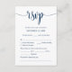 Esta es la hermosa tarjeta de gabinete Moderno, Caligrafía, Romántico RSVP (Respond), con un elegante tema azul marino, donde puedes editarla, cambiarla de color y formatearla según tus necesidades de diseño, con opciones de comida, asientos reservados, número de asistentes y opción de petición de canciones. Teesha Derrick