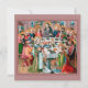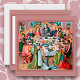 Este panel, pintado en 1503 por un anónimo artista de origen romano, muestra la cena mencionada en Juan 12:1-3 que tuvo lugar en Bethany después del levantamiento de Lázaro y justo antes de que Jesús llegara a Jerusalén el Domingo de Ramos. Como tal, el ánimo es festivo —más alegre y menos sombrío que el de la Última Cena que tuvo lugar el jueves siguiente (Jueves de Maundy). Es el panel central del retablo tríptico que honra el altar de Martha del coro sur de la Iglesia de Nuestra Señora (Liebfrauenkirche) en Oberwesel, Renania-Palatinado, Alemania. + Aquí, Jesús y Sus Doce Apóstoles están sentados en una mesa redonda, presumiblemente uno de los varios en la sala, ya que el Evangelio alude a la presencia de más asistentes, incluyendo Lázaro. La mesa se ve con normalidad, cuanto mejor se ve la vajilla y los productos alimenticios. Los apóstoles conversan entre ellos. Uno (¿San Bartolomé?) corta el pan. En el centro de frente, San Marta, con un delantal y una bandeja de pescado, sirve (como lo expresa sucintamente San Juan). Mientras tanto, Santa María, erróneamente identificada en el momento en que el retablo fue pintado con la penitente Magdalena y una mujer sin nombre pecador, arrodillada enfrente. Ambas mujeres usan batas de materiales suntuosos. Entre ellos se arrodilla el donante, Canon Peter Luteran, que está representado en una escala muy reducida. La escena llena de gente brilla con energía y el ruido implícito de las conversaciones animadas y la vajilla agitada. + Ver también los artículos de St. Martha (delantales, manoplas de horno, pólvoras y bandejas de servir) de nuestra serie Apron Saints (q.v.) para mezclar y emparejar! + Crédito de la imagen (M 055): Foto de Rolf Kranz de una pintura de dominio público con más de 100 años de antigüedad de WikiMedia Commons (por Rolf Kranz - Own work, CC BY-SA 4.0, https://commons.wikimedia.org/w/index.php?curid=106002864). La foto ha sido cortada firmemente en un rectángulo sin fronteras.
