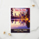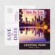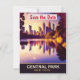 Invitación de boda de Central Park para guardar la fecha, tarjeta postal de viaje. Puesta de sol sobre el lago y los edificios a lo lejos.