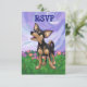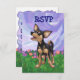 Desfile Animal Jugador Chihuahua Perro RSVP Personalizable Niños Cumpleaños Tarjeta RSVP traída a usted por Imagine Eso! El diseño presenta nuestro lindo Chihuahua negro y marrón parado en un jardín con un hermoso cielo azul y violeta y un divertido borde violeta. Encontrará este divertido canino de caras y colas pintado por el talentoso ilustrador infantil Traci Van Wagoner, en la coordinación de invitaciones, tarjetas, favores partidarios y mucho más. Gran parte de nuestro divertido equipo fiesta muestra ambos lados del lindo Chihuahua, cabeza y trasero, en un colorido y divertido arte que traerá una sonrisa a la cara de cualquier amante de los animales, amante de Chihuahua o amante de los perros pequeños. Cualquiera que ame los perros estará encantado de usar este cachorro juguetón para su divertido fiesta de temática animal. Por invitación, encontrarás el divertido cachorro que viene y va con esta divertida obra de arte de la cabeza del perro en la parte delantera y la graciosa cola de Chihuahua en la parte trasera con toda la información del fiesta del personalizable. ¡fiesta con este adorable perro negro y moreno! ¡Vaya!