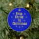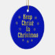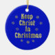 Letras de color oro y copos de nieve contra un fondo azul, Mantener a Cristo en Navidades. La parte posterior se ha dejado en blanco en el funda que le gustaría personalizar.