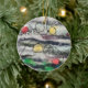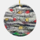 ornamento cerámico redondo con imagen de una cadena de luces feladas, tanto frontal como posterior, cubierto de arte.