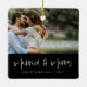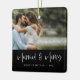 Celebra tu día especial con nuestro elegante Ornamento de fotos en blanco casado y negro con moras. Este exquisito adorno cuadrado de cerámica es la manera perfecta de conmemorar a su boda o ocasión especial y hace un regalo de vacaciones para sus seres queridos. El adorno incluye las palabras "casados y alegres" bellamente con letras a mano en escritura blanca, centradas en la parte inferior. Debajo de esta frase festiva, sus nombres personalizados y la fecha de boda se muestran en una fuente moderna de sans-serif en blanco, añadiendo un toque atemporal y sofisticado. El texto se establece sobre un fondo de rectángulo negro en negrita, lo que garantiza claridad y legibilidad. La foto de tu pareja completa sirve como el telón de fondo para este diseño, convirtiendo el adorno en un querido gesto que capta tu momento memorable. El mismo diseño personalizado se presenta tanto en el frente como en la parte posterior, lo que garantiza que se vea genial desde cualquier ángulo. Diseñado con cerámica de alta calidad, este adorno es duradero y duradero, perfecto para adornar tu árbol de Navidad año tras año. Crea un recuerdo duradero con este singular y personalizado ornamento de fotos blancas casadas y moras negras, diseñado para traer alegría y calidez a tus celebraciones de vacaciones.