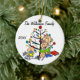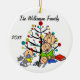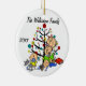 Un adorno de vacaciones de Navidades de conservas de cerámica redonda de bonito incluye a una familia con figuras de palos que incluye a una madre, un chica, un niño pequeño y un bebé que duermen, así como a un gato familiar delante de un árbol de Navidad decorado con áreas donde puedes personalizar con tu nombre familiar y el año en curso! ¡Este adorable adorno por el recuerdo de las festividades hace un gran regalo para la joven familia para conmemorar un año especial!
