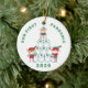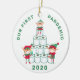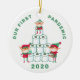 Este divertido adorno de vacaciones incluye algunos elfos ocupados apilando rollos de papel higiénico. Hay un texto verde curvo en mayúsculas que dice "Nuestra primera pandemia". Debajo de los elfos está el año "2020 en verde verde sobre un brillante fondo blanco. La espalda tiene otro elfo con una máscara, decorando un árbol de Navidad. Los colores son verde, rojo, marrón y rosa.