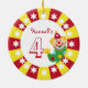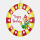 con estrellas blancas en círculo sobre un fondo rojo y amarillo alrededor de los bordes. Dentro del círculo hay un payaso feliz mirando hacia afuera y saludando. El texto puede cambiarse fácilmente para su propia ocasión especial. Perfecto para el niño que ama el circo y los payasos.