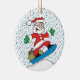 Este adorable adorno navideño presenta a Santa Clause entregando paquetes en una snowboard.